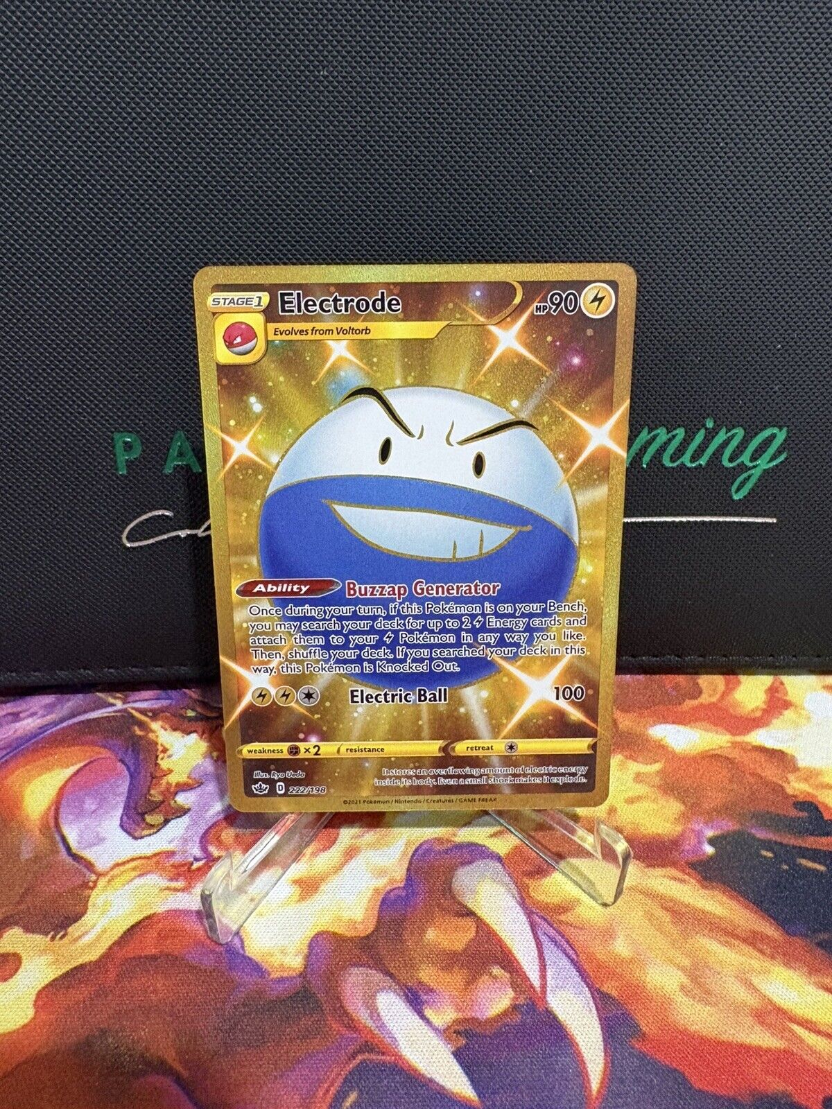 Dive into the electrifying world of Pokémon with the TCG Electrode Sword & Shield - Chilling Reign 222/198 Holo Secret Rare card. A stunning addition to any collection, this card features the iconic Electrode, illustrated with dazzling art by Ryo Ueda. The lightning attribute bolts onto the battlefield, promising to shock and awe your opponents with its electrifying power.