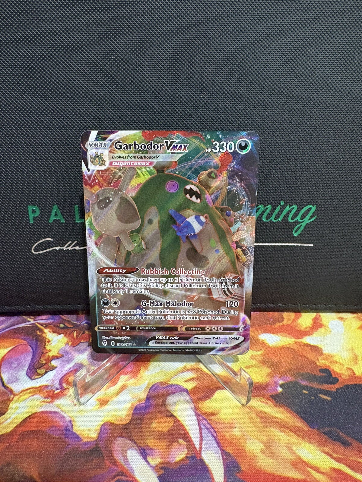 Elevate your Pokémon TCG collection with the Garbodor Vmax, from the highly sought-after Evolving Skies set. This Ultra Rare card, numbered 101/203, features a stunning Holo finish that catches the light, making it a standout in any display or deck. With an impressive 330 HP and the dark majesty of Darkness as its attribute, this card is sure to be a formidable contender in battle.