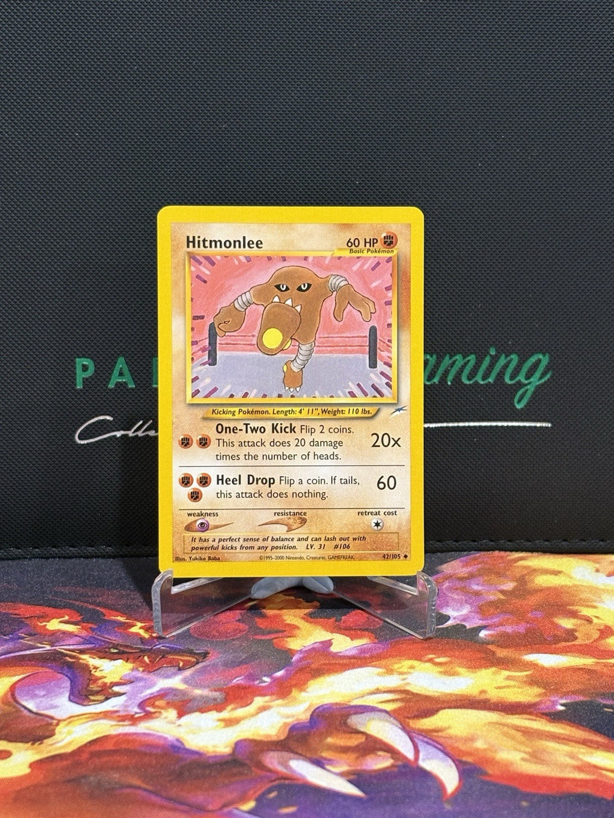 Unleash the power of Hitmonlee from the Neo Destiny set with this Pokémon TCG card, a must-have for collectors and players alike. Featuring the iconic illustration by Yukiko Baba, this Uncommon card is numbered 42 and boasts a regular finish, adding a classic touch to your collection. With 60 HP and classified as a Fighting-type, Hitmonlee is ready to take on any challenge in your next battle.
