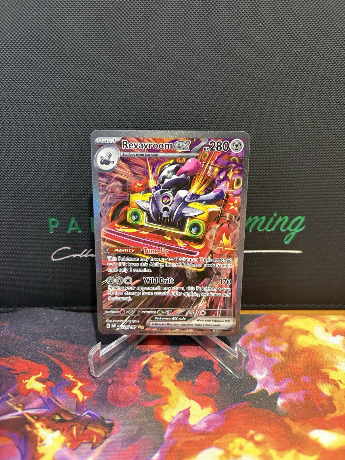 Step up your Pokémon TCG collection with the Revavroom EX from the Sv03: Obsidian Flames set, card number 224/197. This special illustration rare card features a stunning holo finish that brings the fierce Flame-type monster to life. With a robust 280 HP, it's ready to take on any challenger in your next battle.