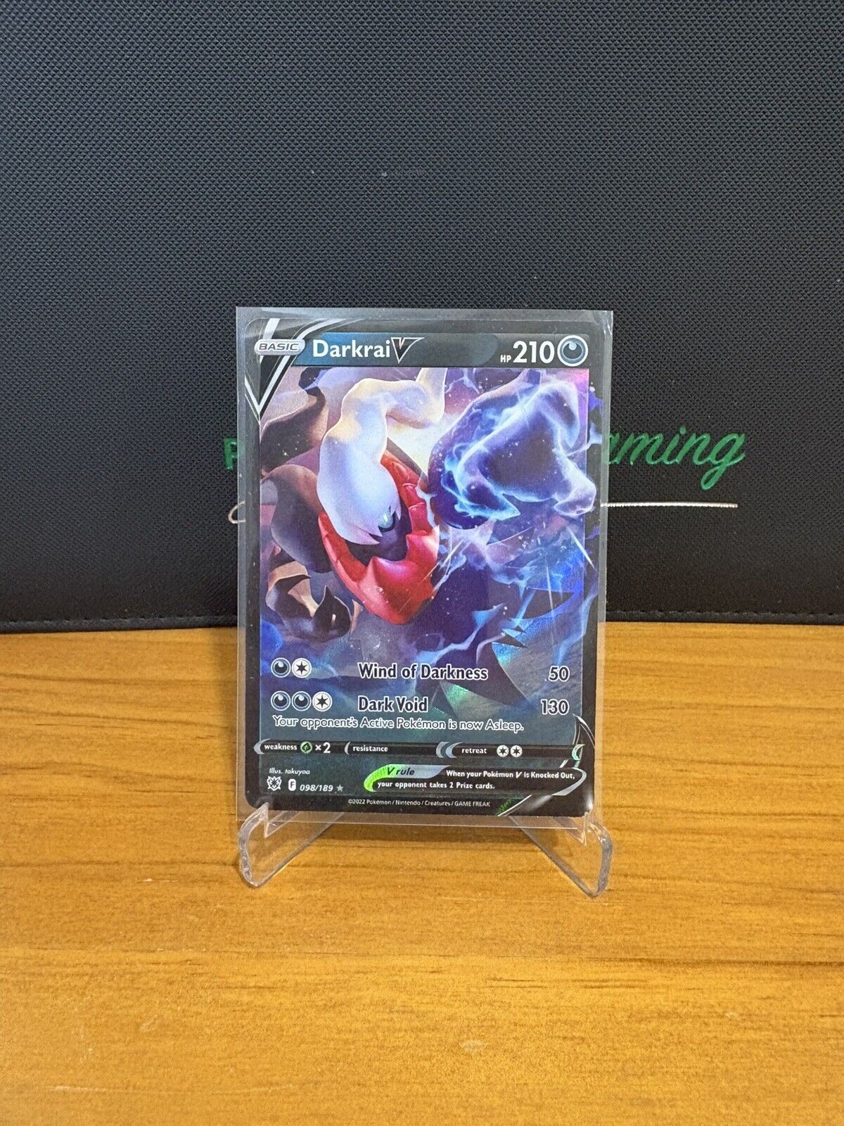 The Pokemon TCG Darkrai V card from the Sword and Shield set is a rare find with a dark colour scheme and holographic finish. This Ultra Rare card features the iconic character Darkrai in its Basic stage, making it a valuable addition to any Pokémon TCG collection. The card is from the Astral Radiance set, numbered 98 out of 189, and is in English language, making it perfect for fans and collectors alike.