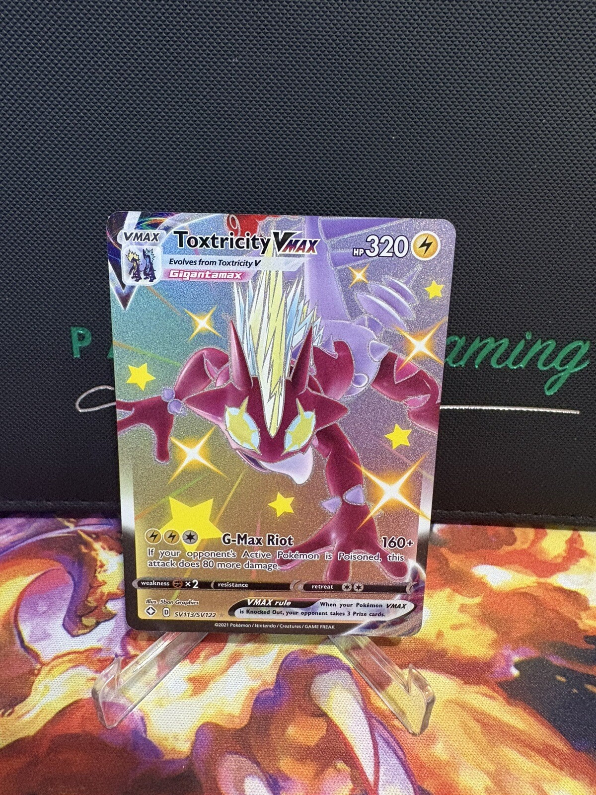 Dive into the world of Pokémon TCG with the Toxtricity VMAX Shining Fates Sv113/Sv122 card, a must-have for enthusiasts and collectors alike. Featuring the Lightning-type Pokémon in its impressive VMAX form, this card is a standout with its Shiny Holo Rare finish, ensuring it catches the eye of both players and collectors.