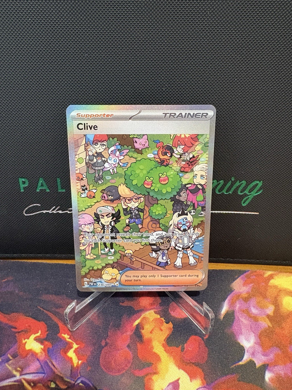 Crafted by Nintendo, this Pokémon card is not autographed and is not graded, presenting a raw and authentic addition to your compendium. With its rarity classed as 'Rare', the card 'Clive' is numbered 236/091, indicating its special illustration status. Expand your deck with this intriguing card and bring a touch of the Paldean region's mystique to your battles and displays.
