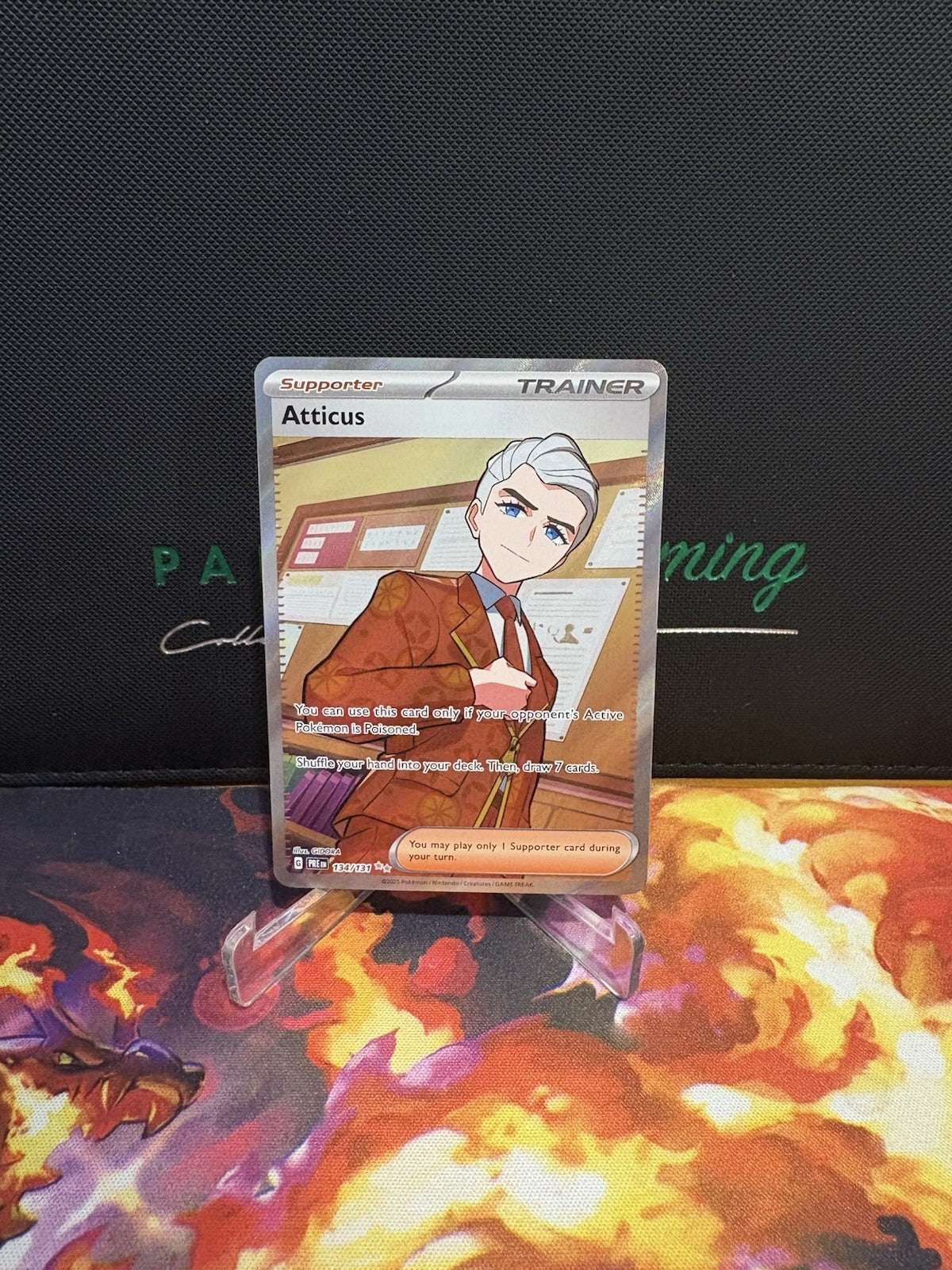 Dive into the world of Pokémon TCG with the ultra-rare Atticus card from the Prismatic Evolutions set. Boasting a stunning full art design, this Trainer-Supporter card features the enigmatic Atticus, depicted in intricate detail by the talented illustrator GIDORA. With card number 134/131, it's a standout addition to any collection, sure to impress both players and collectors alike.