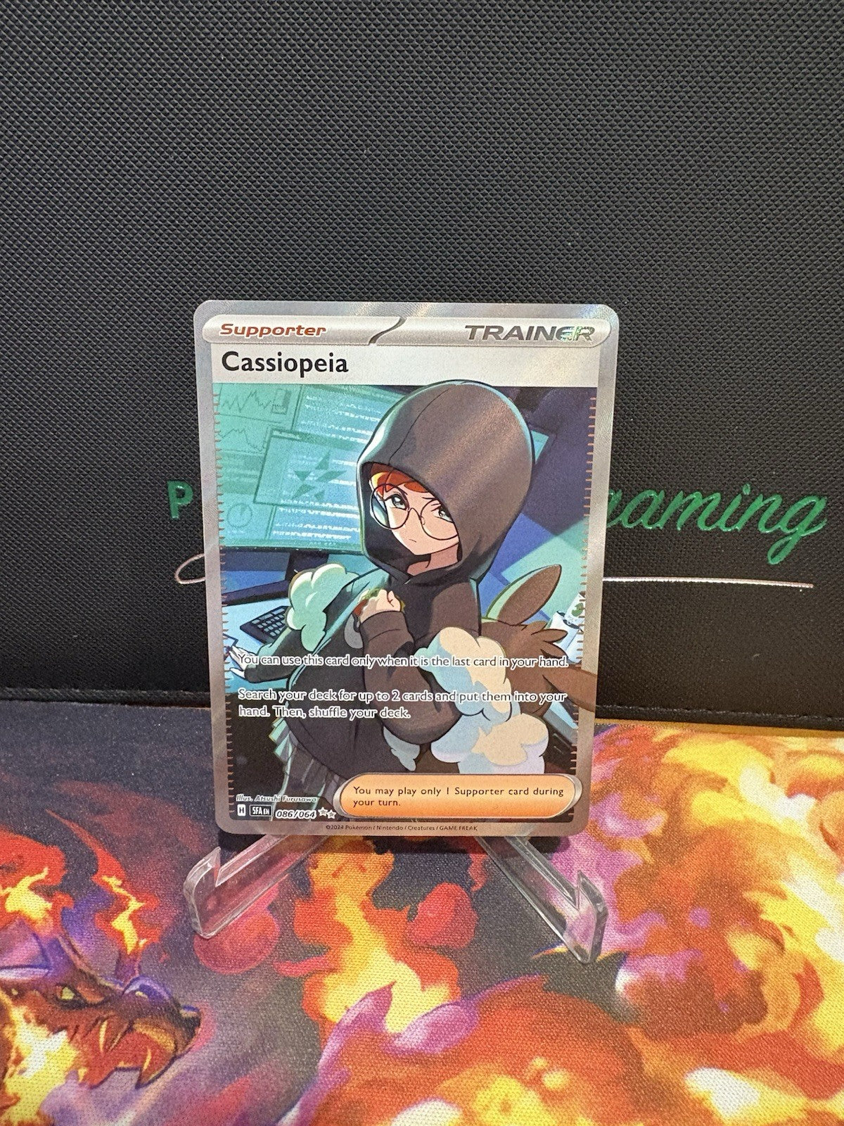 Elevate your Pokémon TCG collection with the Cassiopeia - Shrouded Fable 086/064 Full Art Rare Card. A standout piece from the Shrouded Fable set, this card features a mesmerising full art design that captures the essence of the celestial mythology woven into the Pokémon universe. The English language card adheres to the standard card size, making it a perfect fit for any standard card protector or binder.