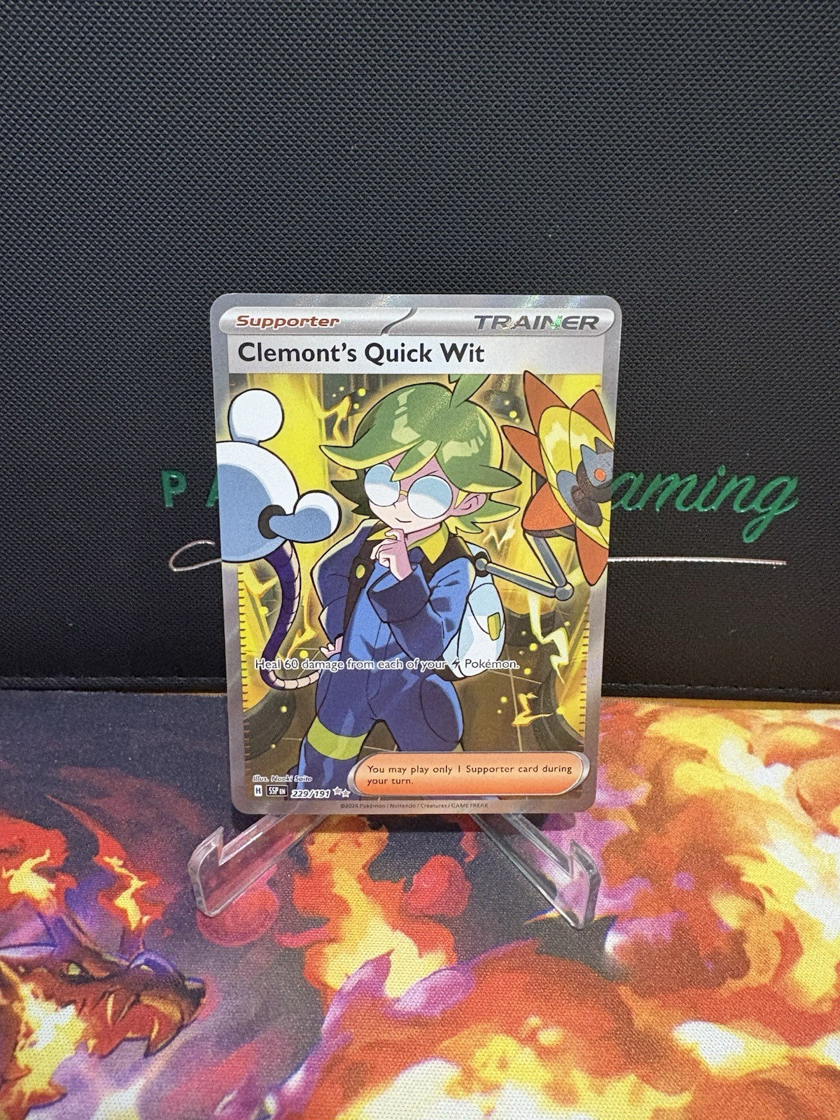 Dive into the world of Pokémon TCG with Clemont's Quick Wit, card number 229/191, from the electrifying Surging Sparks set. This Ultra Rare card showcases the cunning Clemont, ready to outsmart opponents with its strategic abilities. Manufactured by The Pokémon Company, this card promises to be a dazzling addition to any collection or competitive deck.