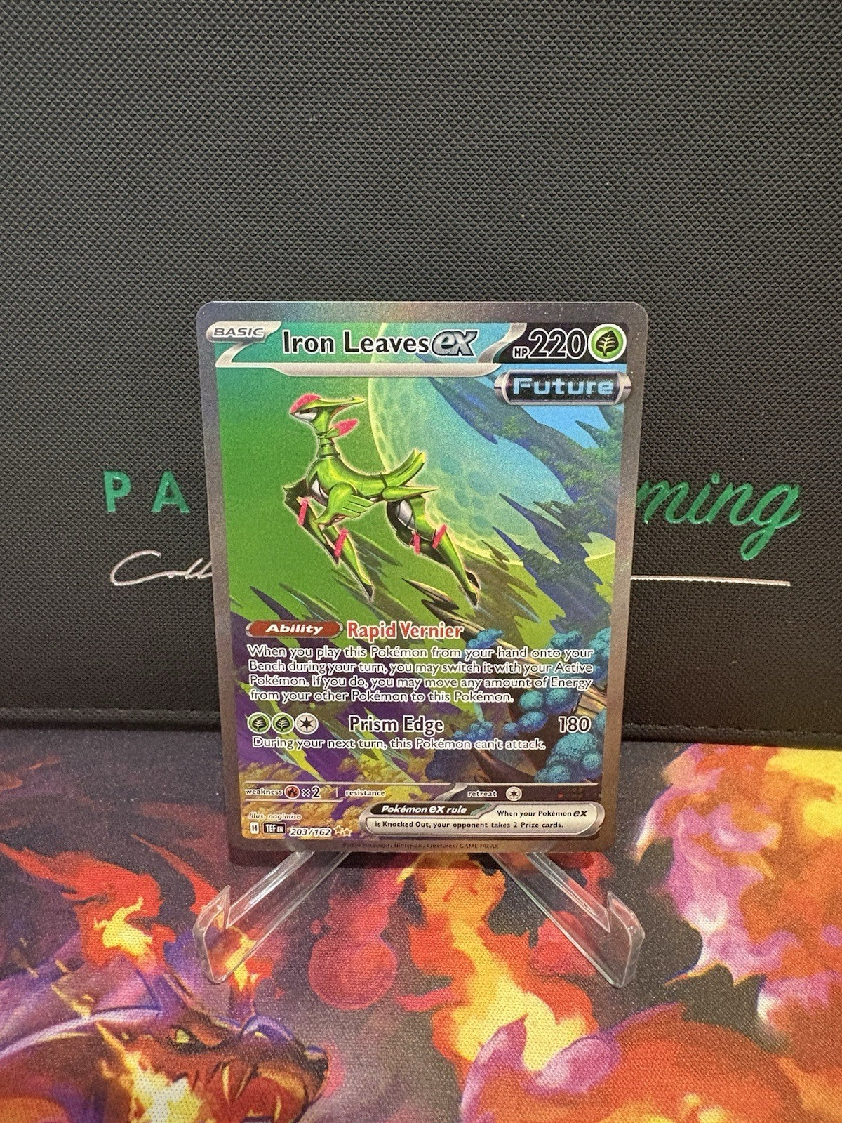 Unleash the power of Iron Leaves Ex, a prized addition to any Pokémon TCG collection. From the Temporal Forces set, this Stage 2 Pokémon card boasts a stunning alternative art finish, capturing the essence of its Grass-type abilities. Card number 203/162, it's a must-have for enthusiasts seeking to enhance their gameplay with its EX speciality.