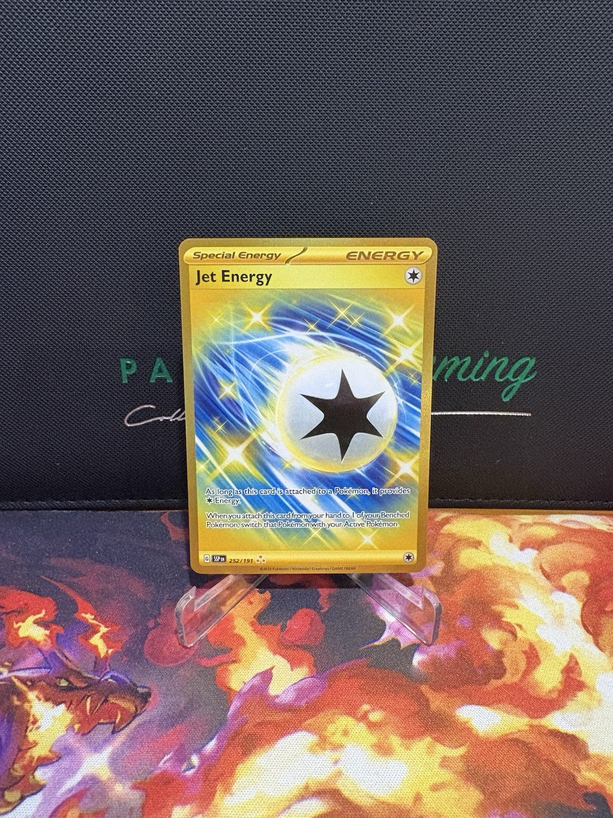 Unleash the power of Jet Energy with this rare Pokémon TCG card from the Surging Sparks set. Card number 252/191 features a stunning full art design that captures the essence of this Energy-type Pokémon. The holographic finish adds a dazzling touch to the already impressive artwork, making it a standout addition to any collection.
