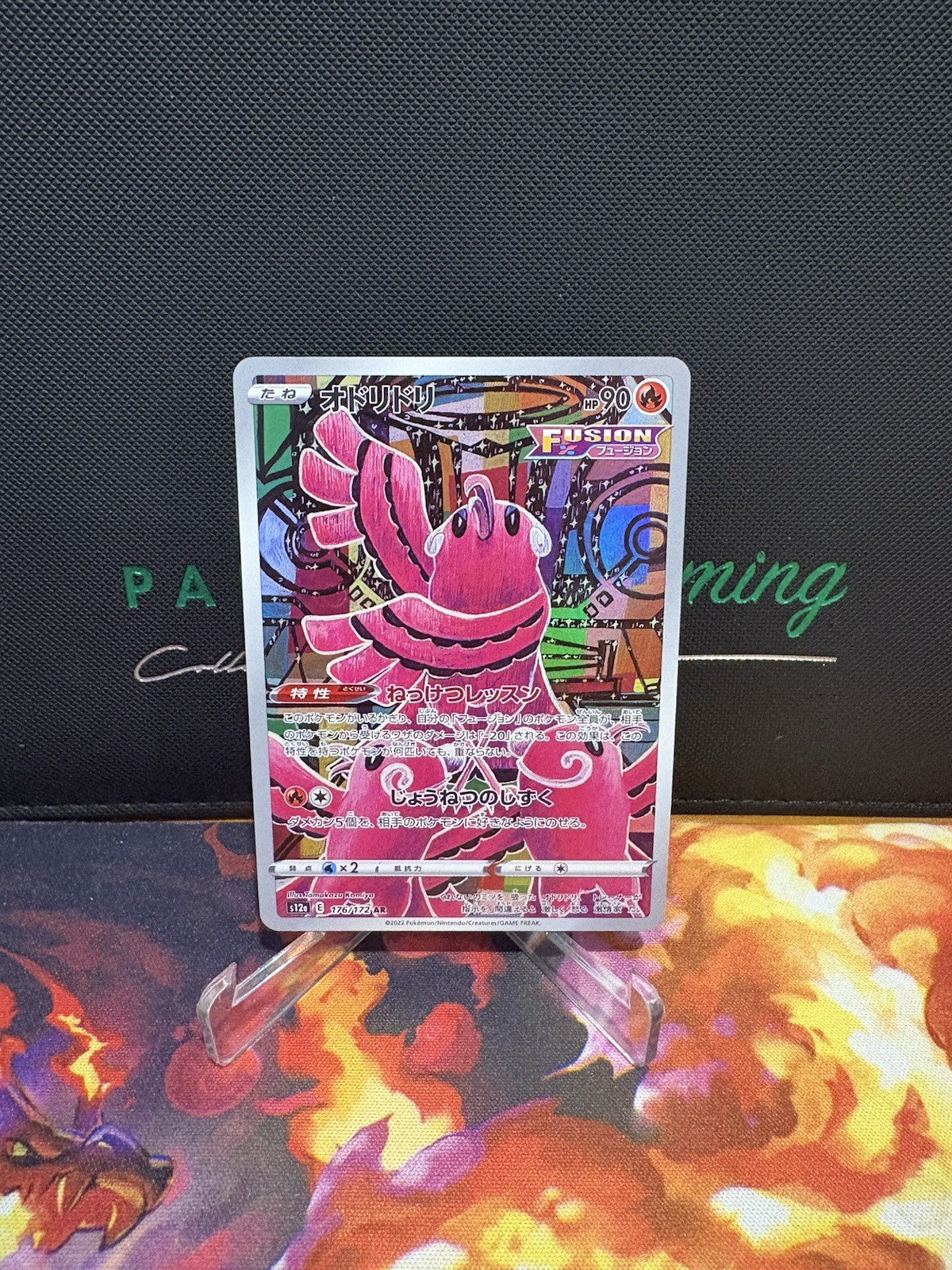 Step up your Pokémon TCG collection with the vibrant Oricorio card from the VSTAR Universe set. A Secret Rare gem, this card features the fiery Oricorio in its Basic stage, boasting a stunning foil finish that captures the eye with every light reflexion. Card number 176/172 shines in its Japanese language version, adding an exclusive touch for collectors and enthusiasts alike.