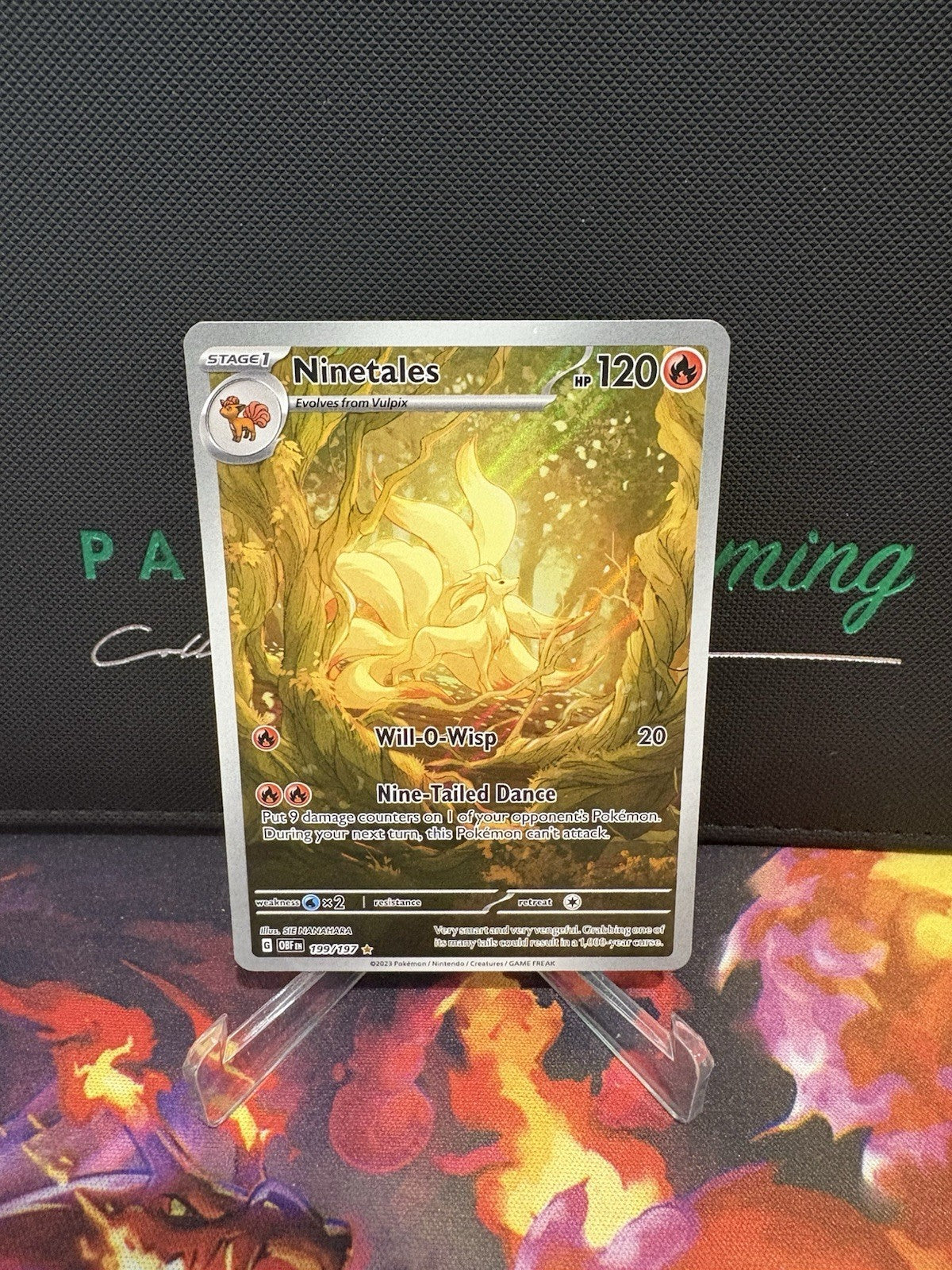 Elevate your Pokémon TCG collection with the Ninetales card from the Sv03: Obsidian Flames set, card number 199/197. Featuring the majestic Fox-type Pokémon in a stunning Holo finish, this Illustration Rare card captures the essence of Ninetales with its vibrant fire attributes, sure to be a standout in any deck or display.