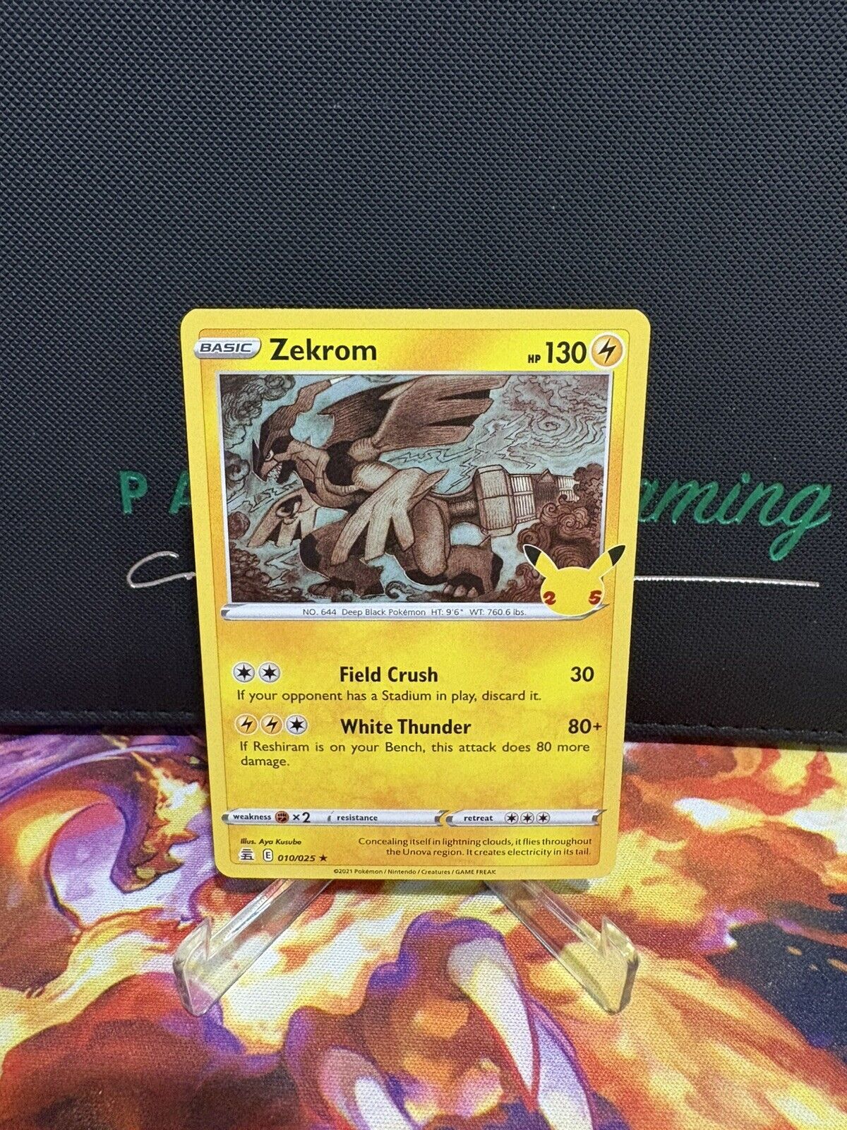 Elevate your Pokémon TCG collection with the Zekrom Celebrations card, featuring the enigmatic Dark-type Pokémon in a stunning Holo finish. As part of the special Celebrations set, this card is a must-have for both collectors and battlers looking to add a touch of lightning-fast power to their deck. The card number 010/025 signifies its unique place in the set, and the artwork by Aya Kusube captures Zekrom's essence with electrifying detail.