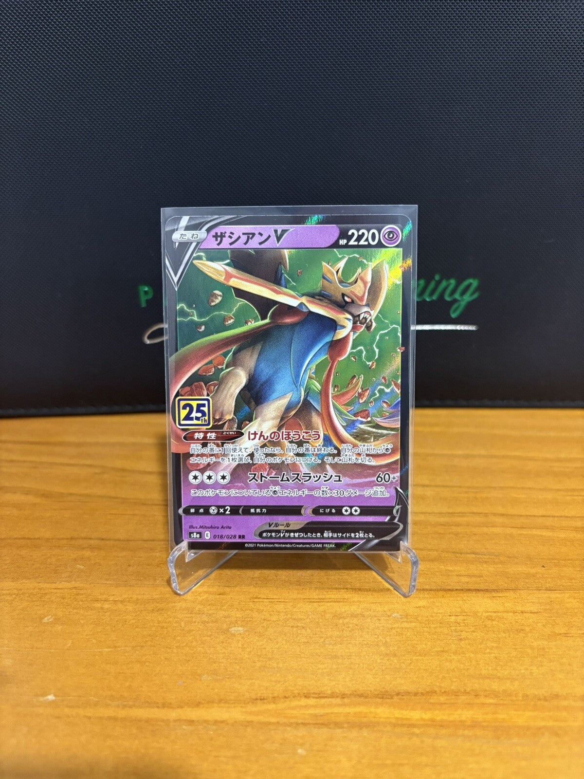 Celebrate the Pokémon 25th Anniversary with this rare Japanese Zacian V card from the 7th Sea CCG. Featuring stunning artwork by Mitsuhiro Arita, this Psychic-type card has 220 HP and a Holo finish. Perfect for collectors and fans of the game, this Double Rare card is a must-have addition to any Pokémon card collection. Don't miss out on this special edition card manufactured in 2021 for the ultimate gaming experience.